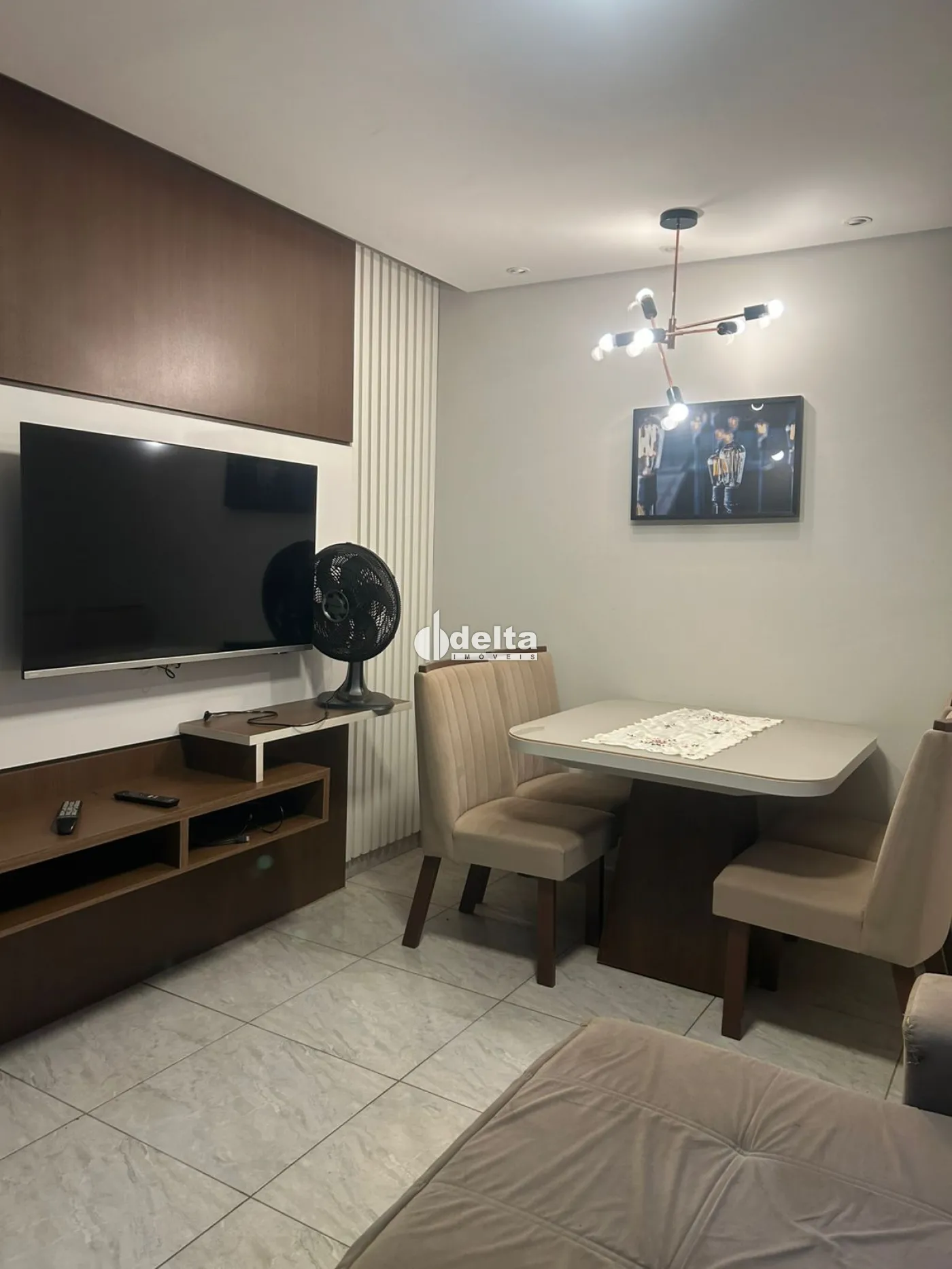 O apartamento conta com 55 m² de área privativa, sendo totalmente planejado e mobiliado, com excelente iluminação e acabamento moderno. Possui sala ampla em dois ambientes com sofá retrátil, rack com painel e TV, mesa com cadeiras e ventilador. São dois quartos com guarda-roupas e camas, sendo um deles com TV. O banheiro social possui armário e box em blindex. A cozinha é planejada com armários, bancada em pedra, cooktop, depurador, filtro elétrico, micro-ondas e geladeira. A área de serviço conta com tanque e máquina lava e seca.