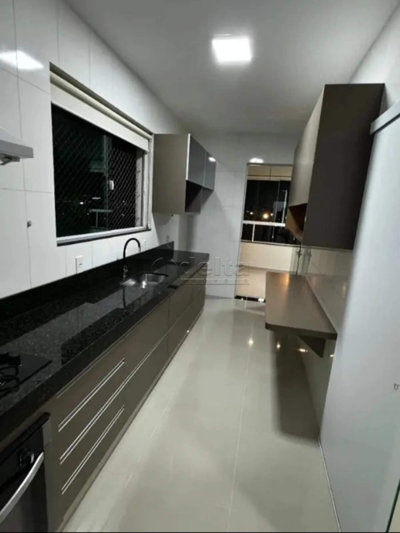 Sala ampla com ar-condicionado, painel e sacada gourmet com churrasqueira, 3 quartos com armários, sendo 1 com sacada e ar-condicionado e 1 suíte, banheiro social com armário e box, cozinha com armário e bancada em granito, área de serviço com armário e 1 vaga de garagem. Aproximadamente 114m². Condomínio com salão de festas e elevador, com água, gás e taxa de condomínio inclusos.