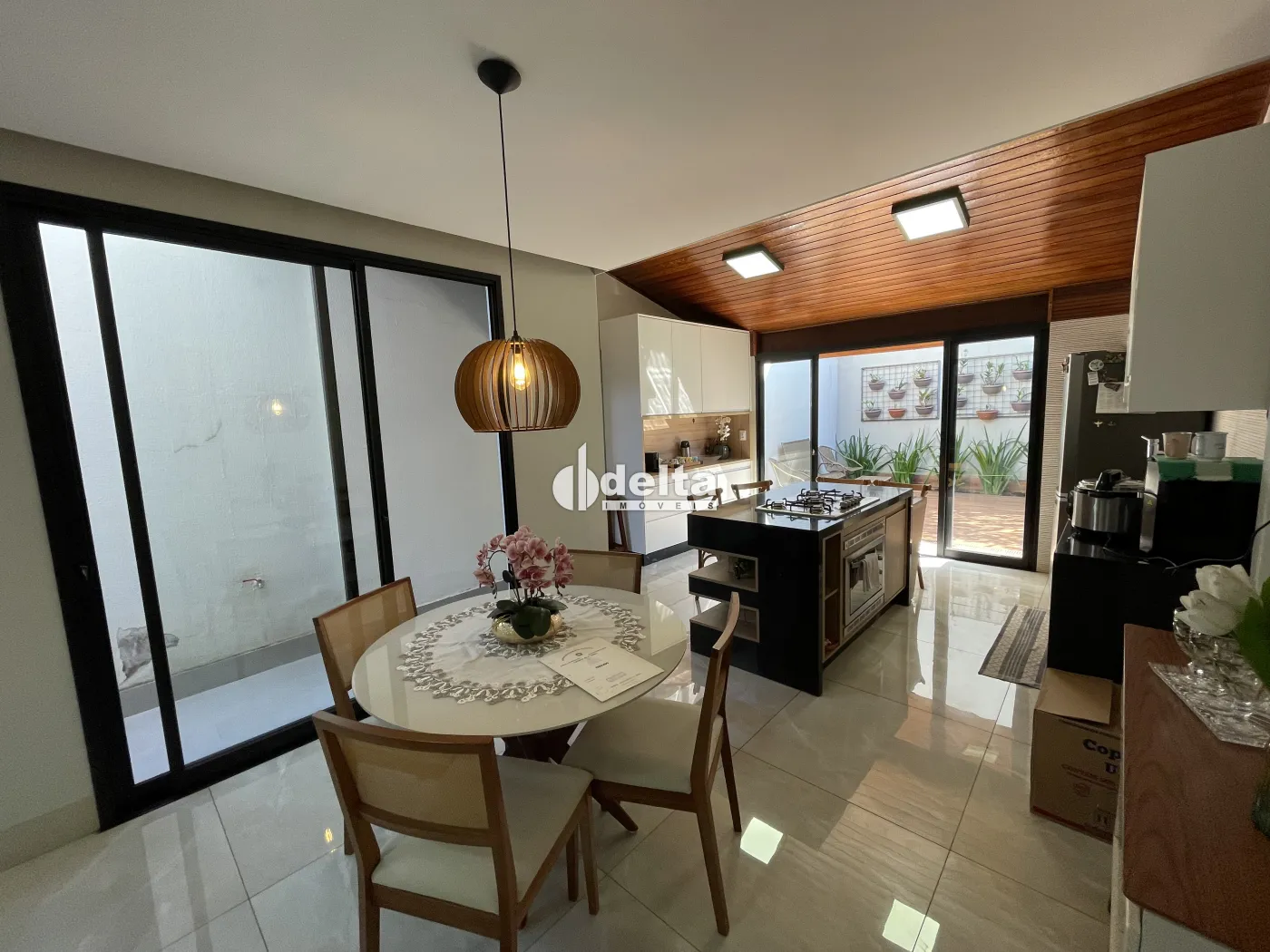 Casa com área construída de aproximadamente 200m², sendo sala em 3 ambientes, 03 quartos com armários, sendo 01 suíte com ar-condicionado, escritório amplo com possibilidade de quarto, banheiro social com box e armários, copa, cozinha planejada com armários em ilha e cooktop, lavanderia com armários, varanda e quintal, em condomínio, com 02 vagas de garagem.