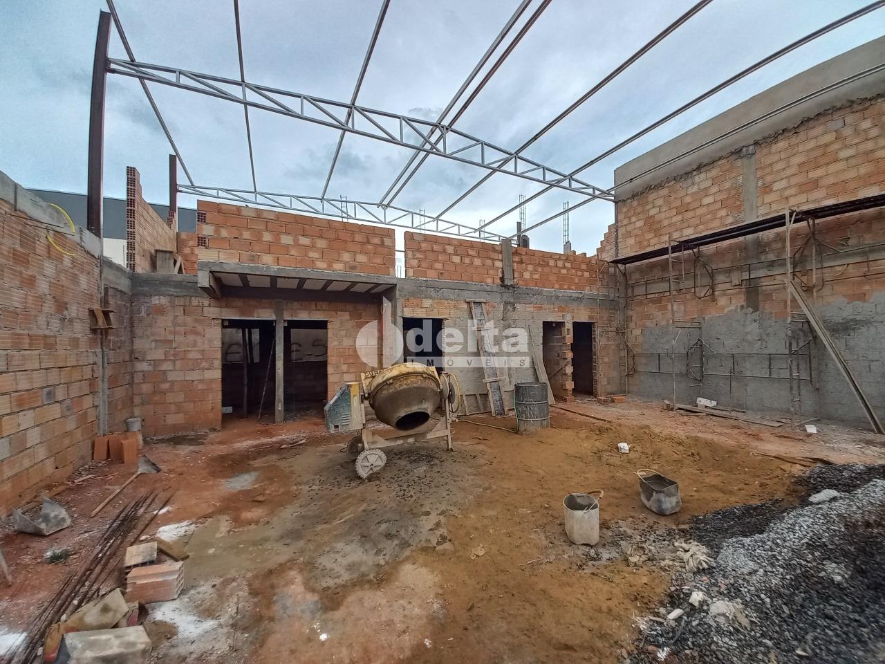 Galpão bairro Tibery, com 350m² de área construída, sendo 300m² de vão livre e 50m² de mezanino, lote de 430m², pé direito de 6 metros, mezanino, escritório, banheiros masculino e feminino tipo vestiário, banheiro externo, frente recuada com entrada para caminhão e estacionamento para 4 carros. Área externa com cobertura .Excelente localização!