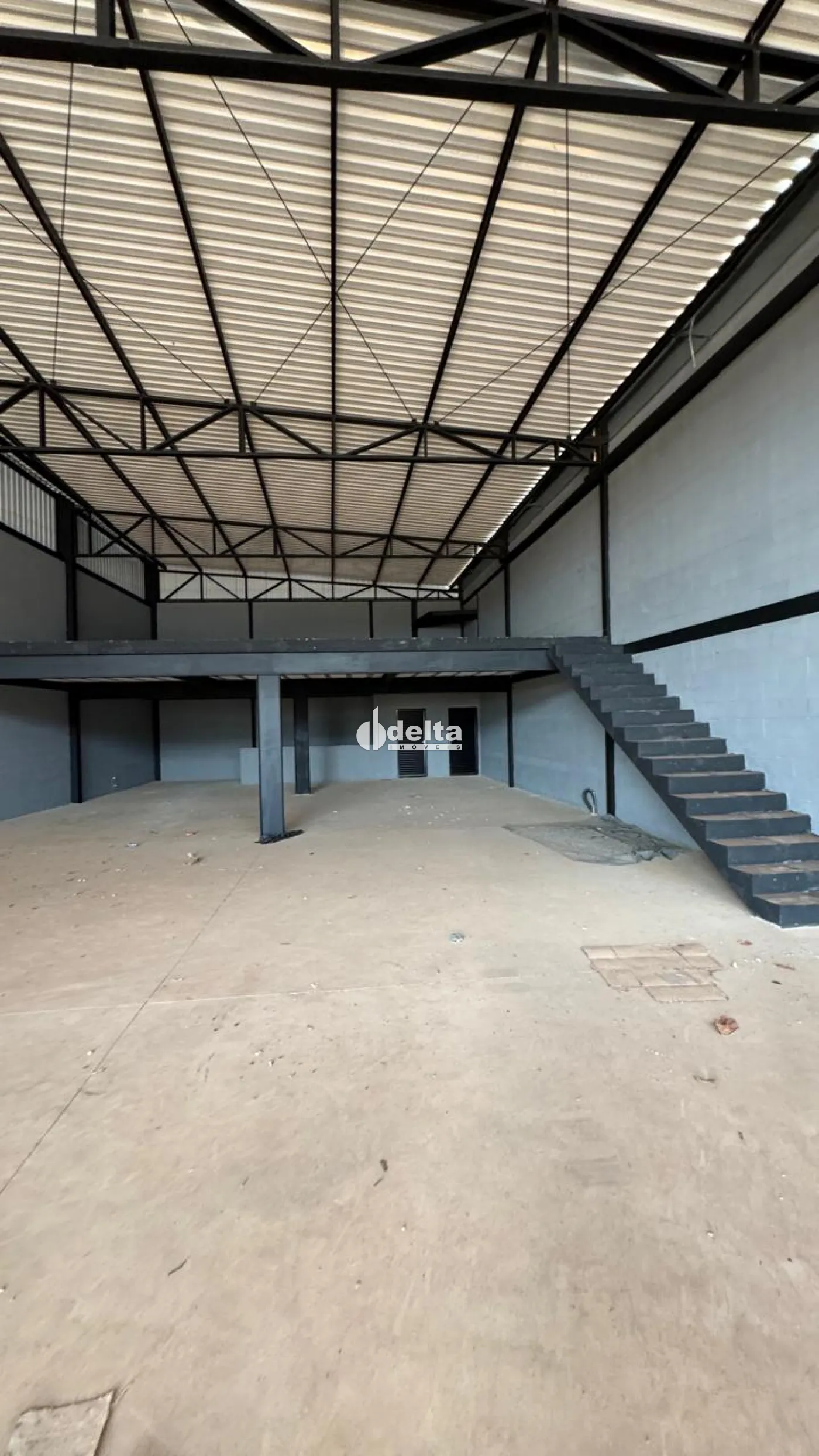Galpão comercial com área de 440 metros, vão livre, pé direito 6 metros e mezanino, recuo com 4 vagas de estacionamento.