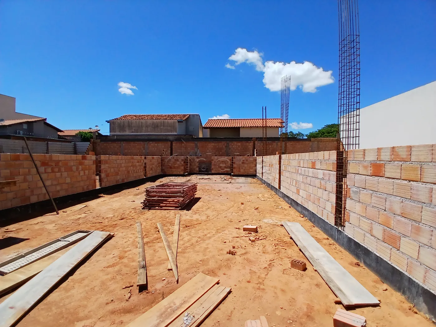 Galpão em construção com aproximadamente 166m² de vão livre, pé-direito de 6,5m, 2 banheiros com acessibilidade, copa, área no fundo impermeável e frente recuada para estacionamento. Localização próxima ao Uberlândia Shopping e comércios variados.