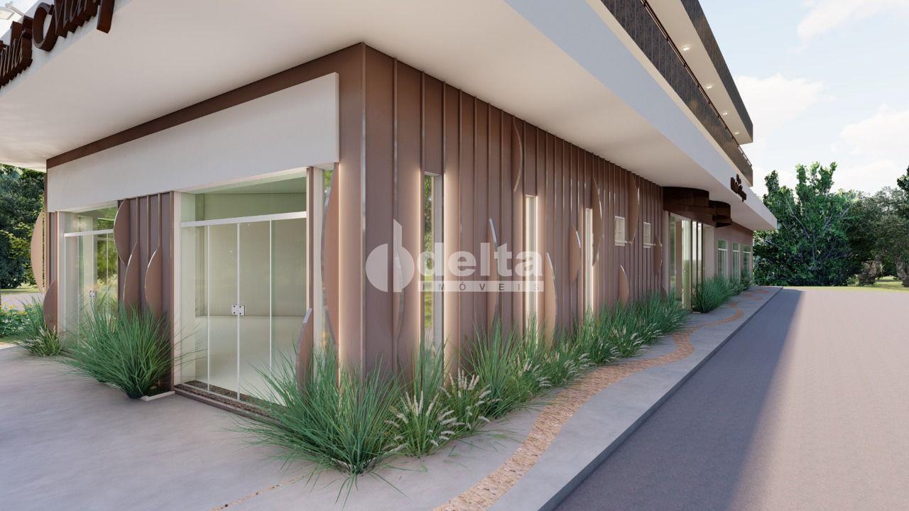 Loja comercial próxima do Parque do Sabiá e Batalhão da PM com frente recuada e estacionamento, acessibilidade, padrão bifásico, porta de aço, aproximadamente 65m² na parte térrea com dois banheiros, um pequeno depósito, escada, mezanino com aproximadamente 35m², piso cerâmica.