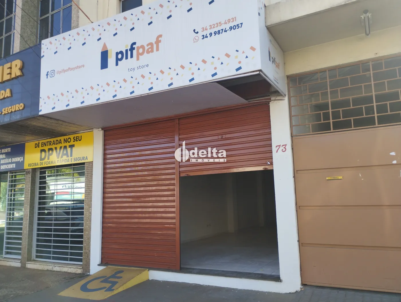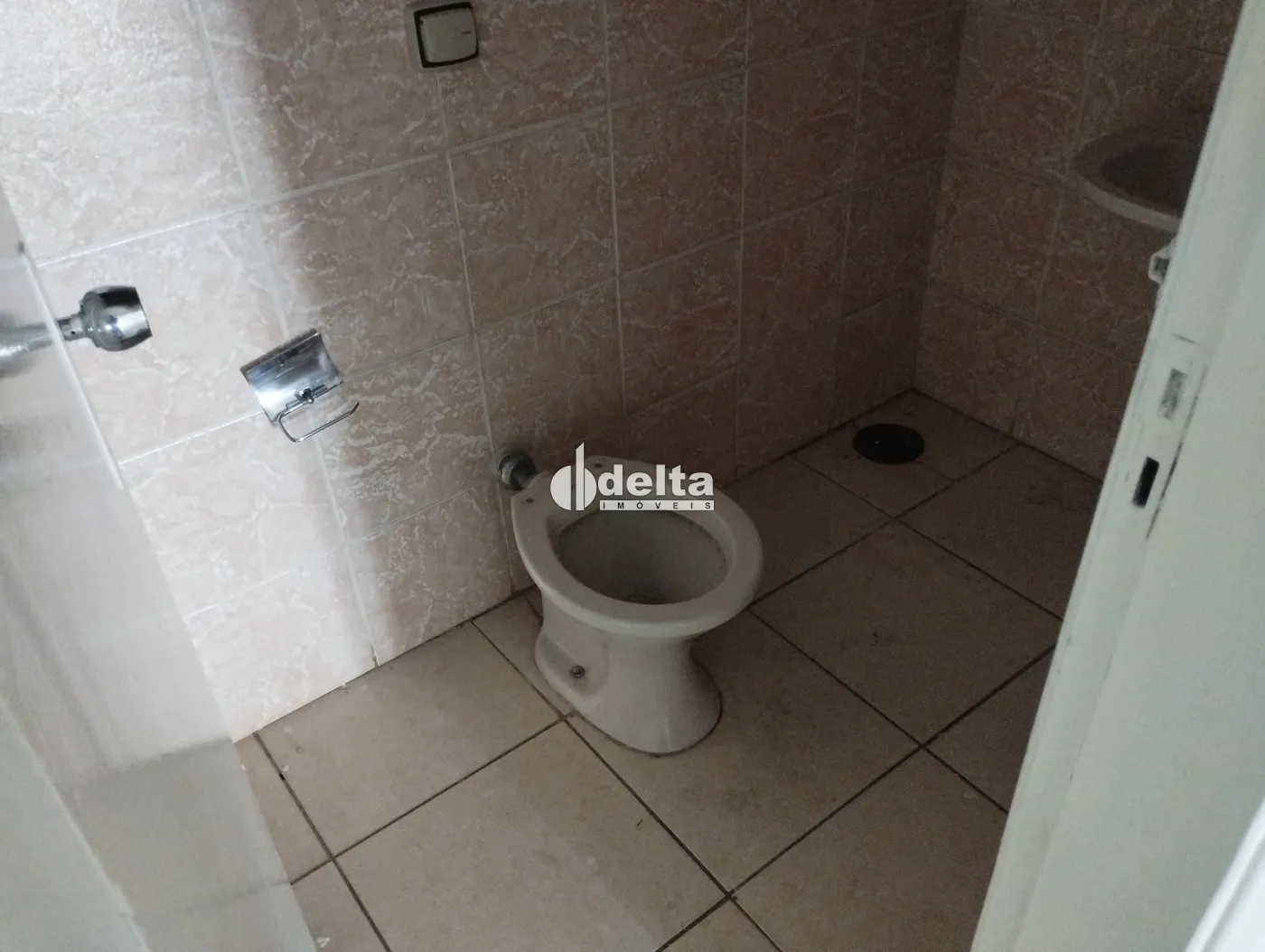 Loja comercial próxima do Parque do Sabiá e Batalhão da PM com frente recuada e estacionamento, acessibilidade, padrão bifásico, porta de aço, aproximadamente 65m² na parte térrea com dois banheiros, um pequeno depósito, escada, mezanino com aproximadamente 35m², piso cerâmica.