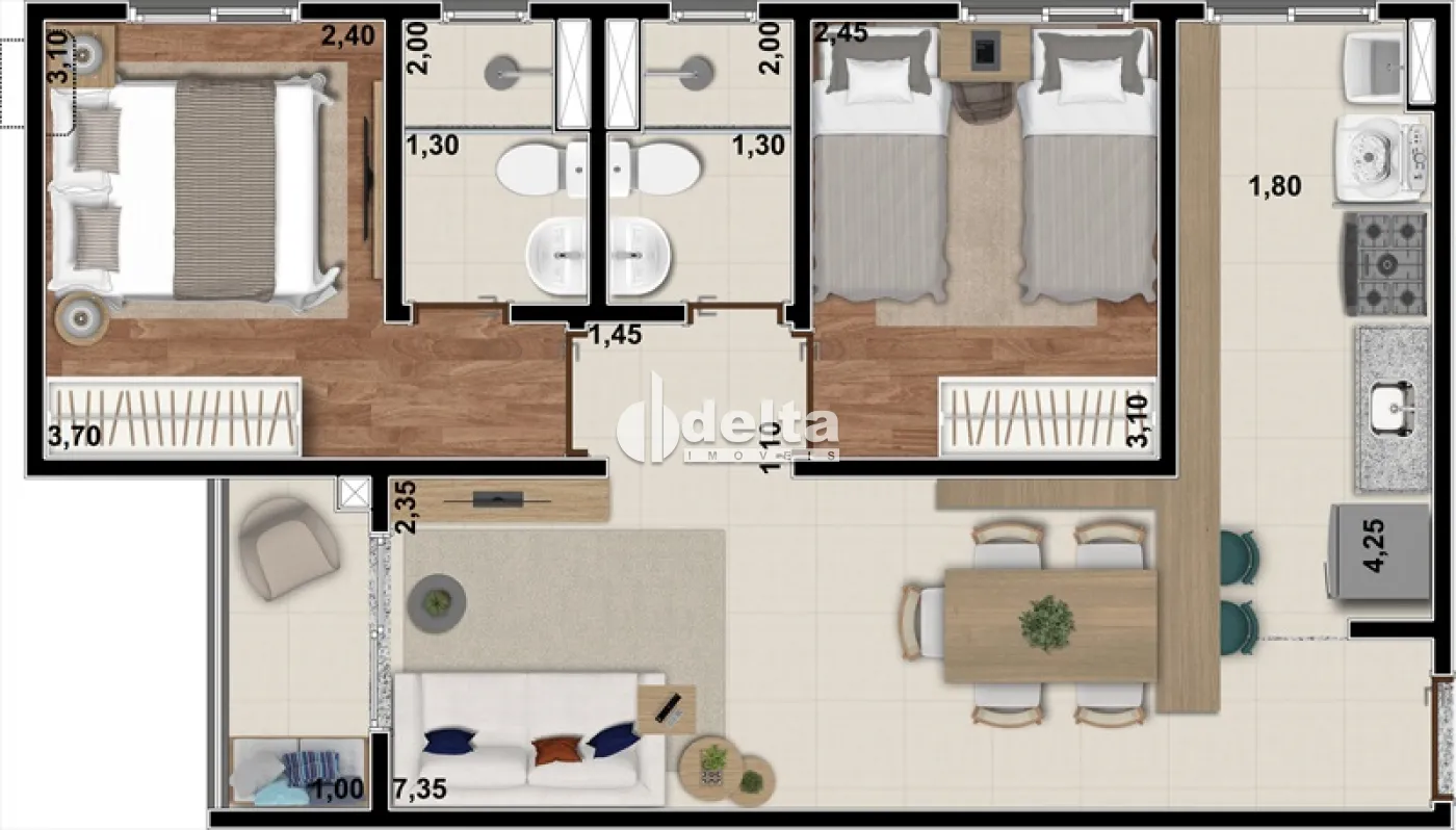 Apartamento novo com 51 m², dois quartos, sendo uma suíte, banheiro social, sala em dois ambientes, cozinha, área de serviço e sacada com vista para a cidade e sol da manhã. Conta com uma vaga de garagem. O condomínio oferece lazer completo, incluindo Car Wash, sauna, Pub Grill, piscinas adulto e infantil, playground, salão de festas, lavanderia, Pet Care, Pet Place e mais. Localização privilegiada, próximo ao Uberlândia Shopping, faculdades, escolas, UMC, postos de saúde e comércios essenciais em um raio de 3 km.