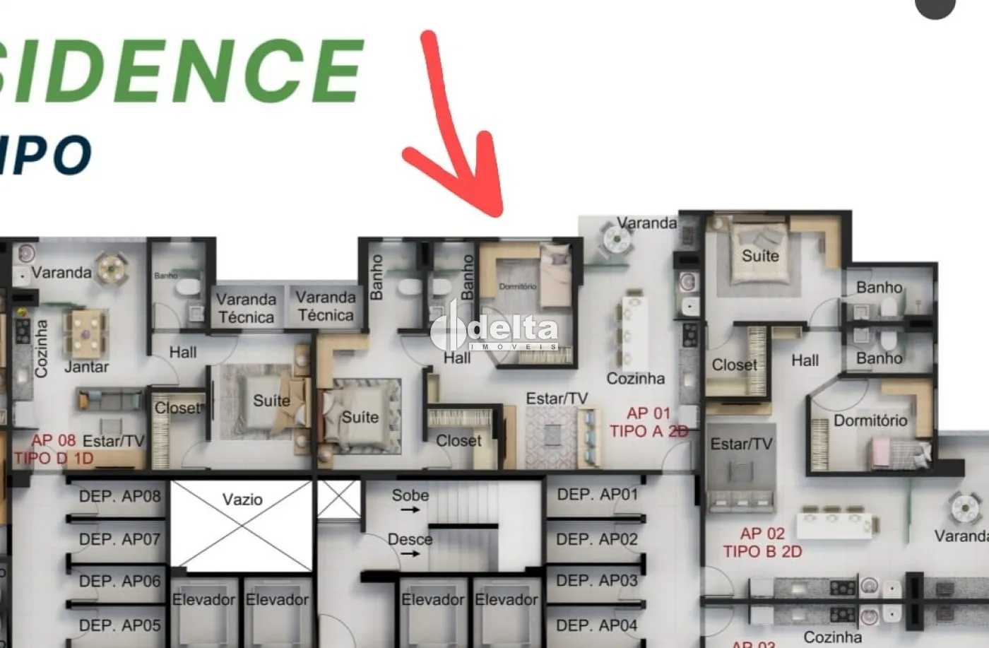 Apartamento com 77,08 m² de área privativa, composto por sala com sacada, 2 quartos sendo ambos suítes, cozinha, lavanderia e 1 vaga de garagem. O imóvel possui infraestrutura para instalação de ar-condicionado na sala e na suíte, ponto de água para filtro, piso em porcelanato, persianas integradas nos quartos, previsão para medição individualizada de gás, aquecimento a gás para os chuveiros das suítes e sistema preparado para TV aberta e fechada.