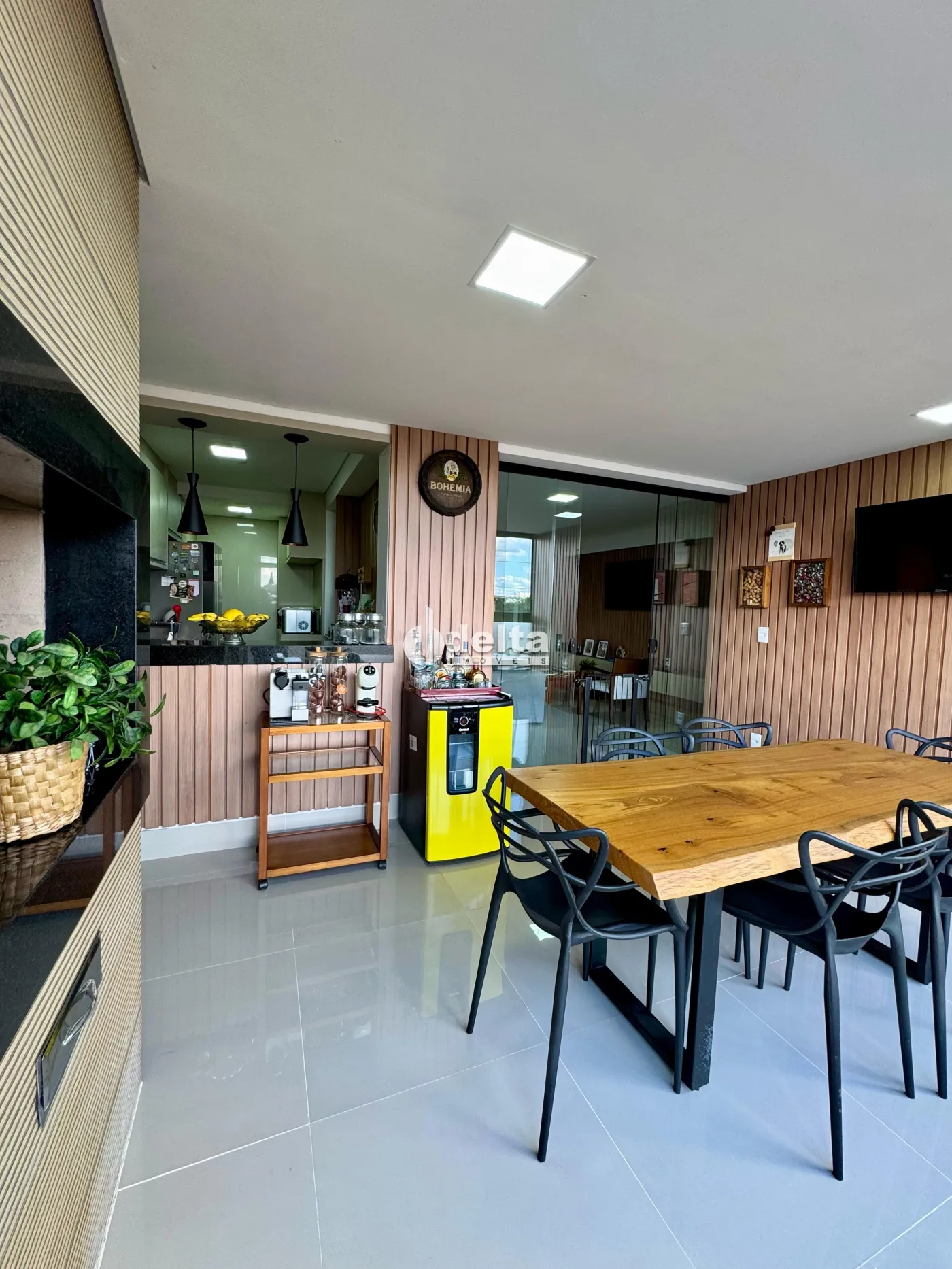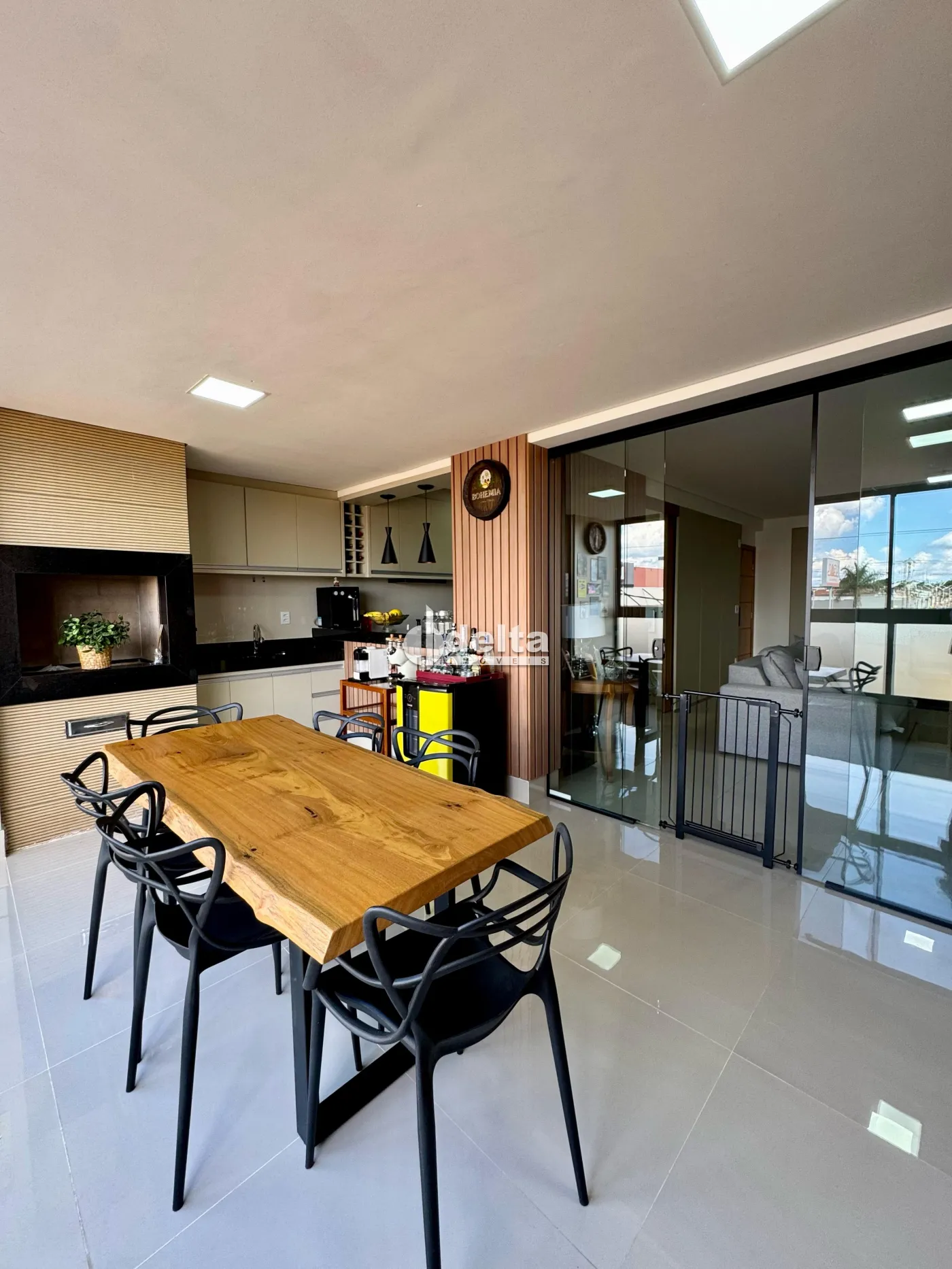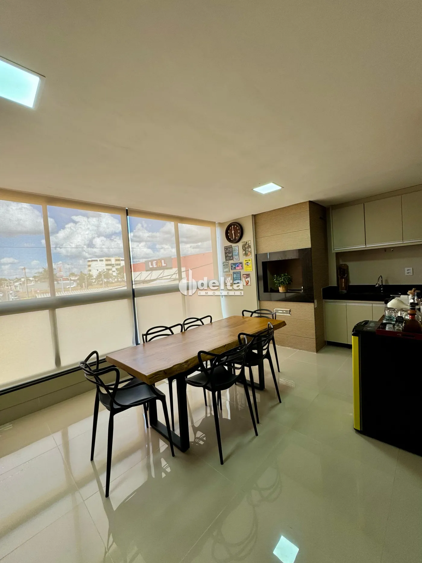 Apartamento semi mobiliado com 3 quartos sendo 1 suíte com espaço para cama king, sala integrada com espaço gourmet e churrasqueira a carvão, cortina de vidro na sacada, área gourmet integrada com cozinha separada da sala, marcenaria ripada nas paredes, fechadura eletrônica, painéis, cristaleira, cooktop de indução 4 bocas Electrolux, forno elétrico de 60 litros, garagem para 2 carros livres no subsolo, sala de 7m² no subsolo, salão de festas e gás encanado.