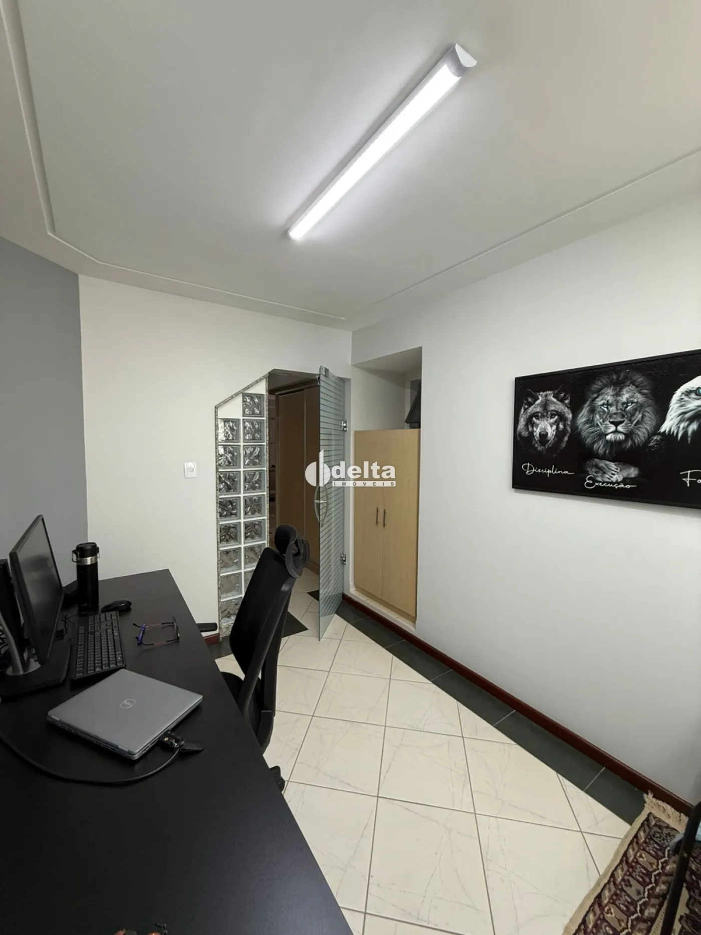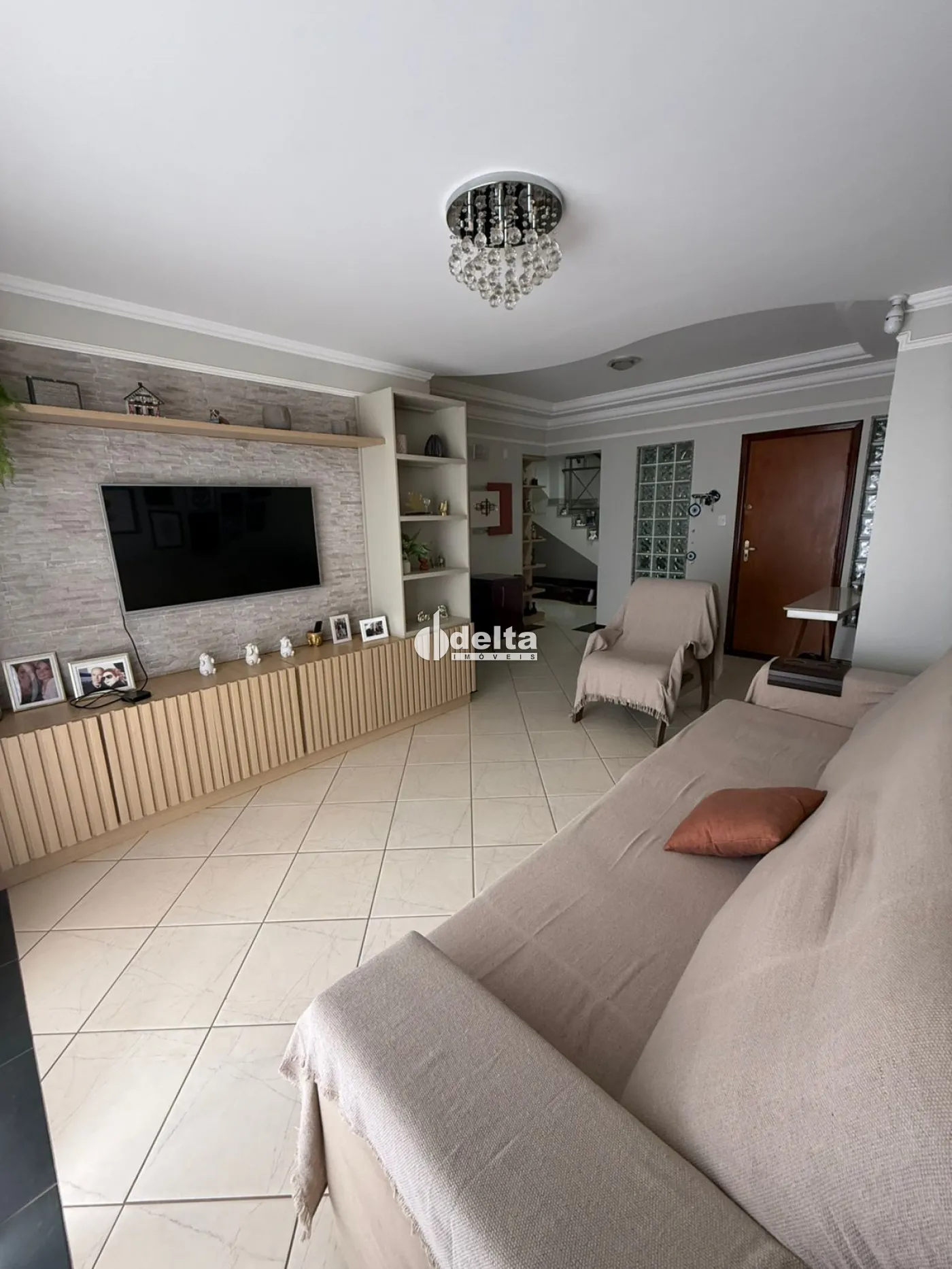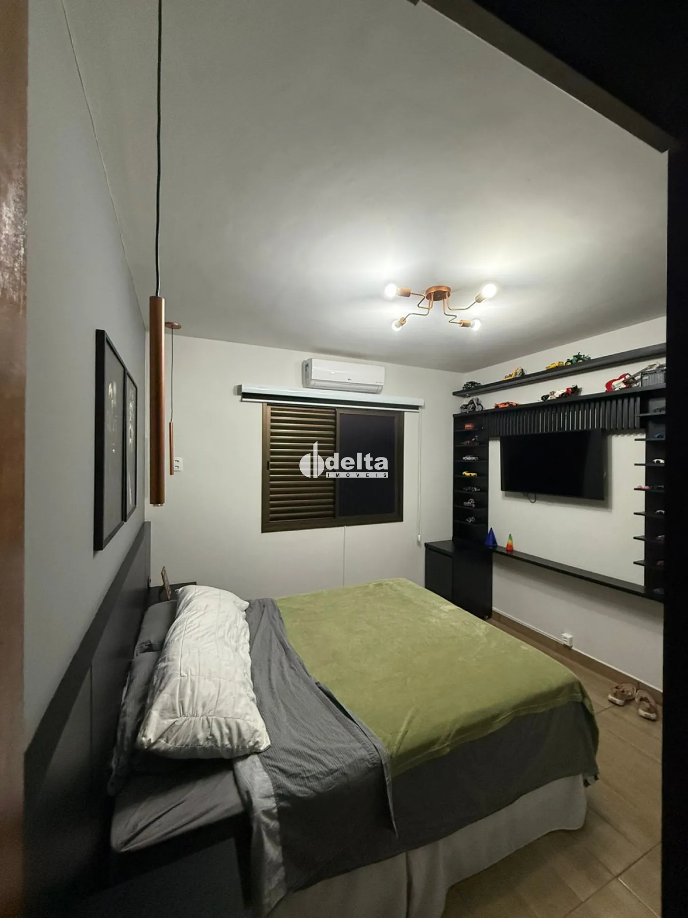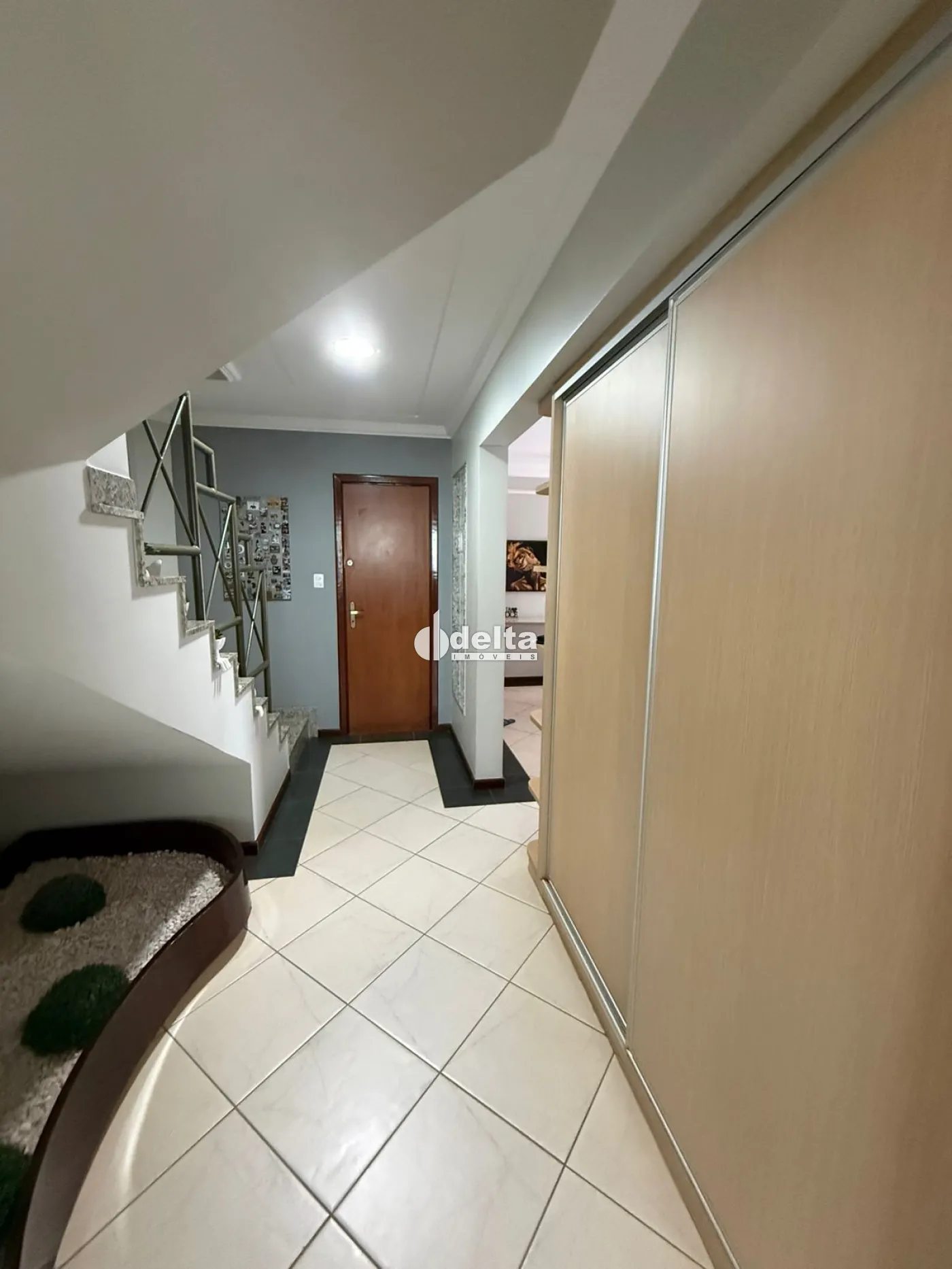 No piso inferior, conta com 3 quartos com armários, sendo 2 com ar-condicionado e 1 suíte com box e armário, banheiro social também com box e armário, sala com painel, armário e varanda com toldo, além de um escritório planejado com armários e ar-condicionado.