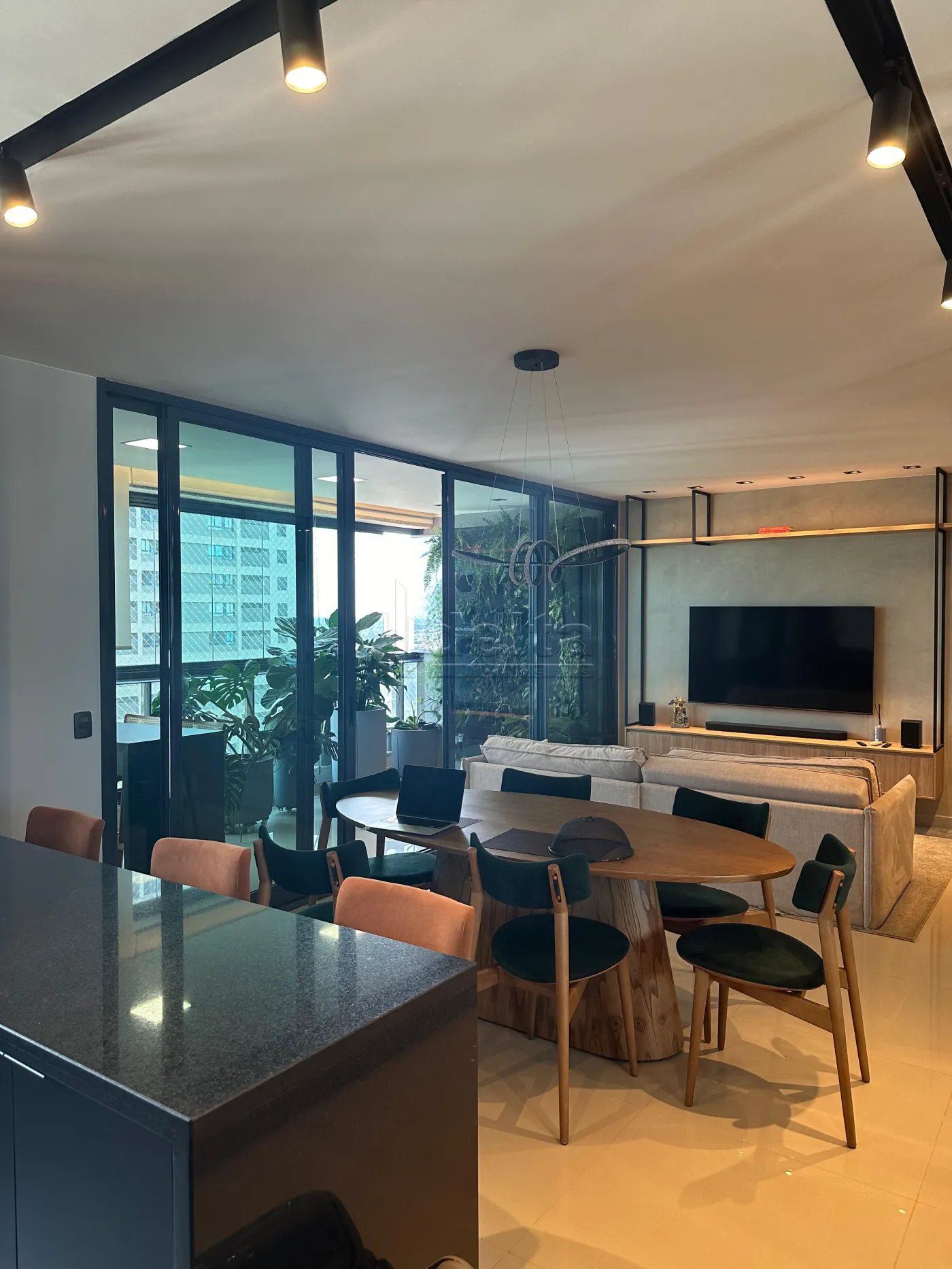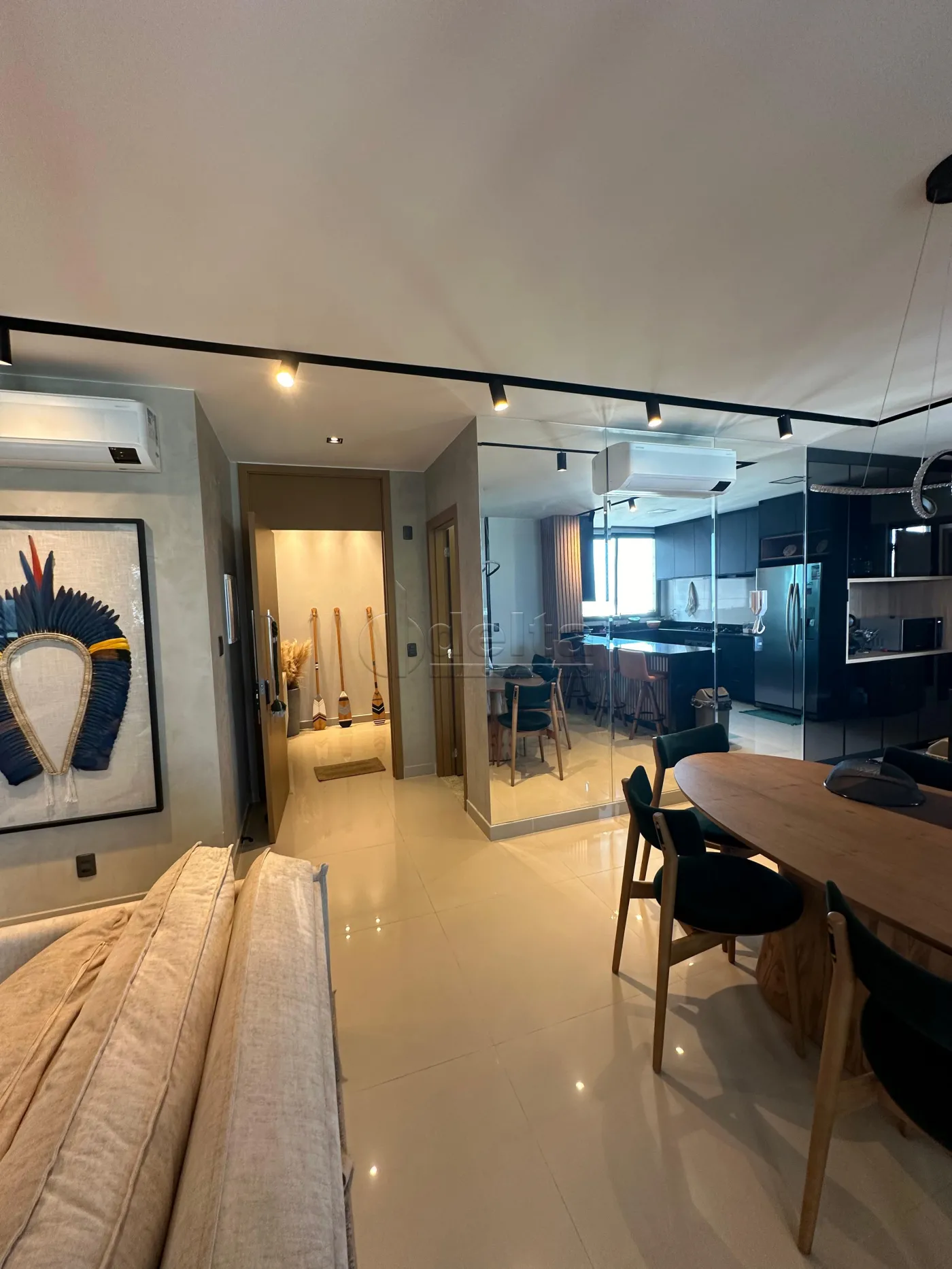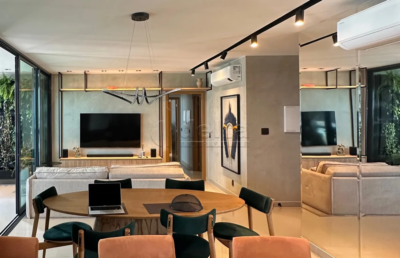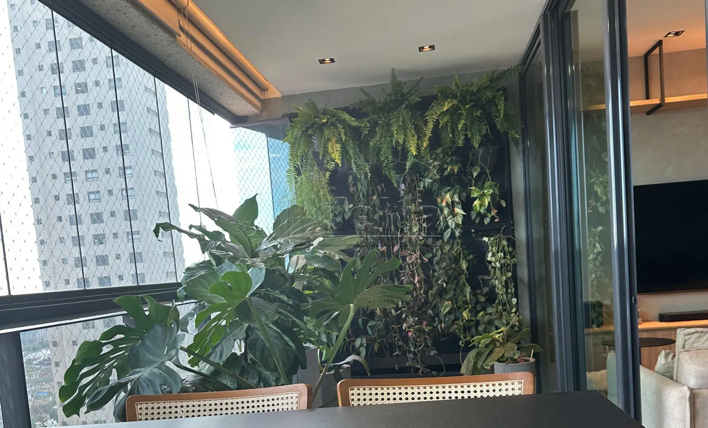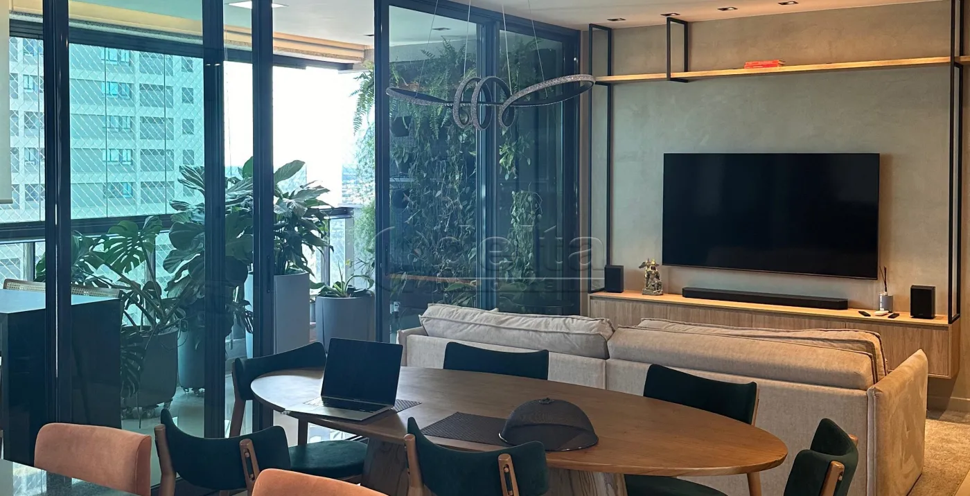 O apartamento possui uma área privativa espaçosa de aproximadamente 151 m², com um design elegante e funcional. Ele conta com hall de entrada, lavabo com espelho, e uma sala em dois ambientes equipada com painel para TV, ar-condicionado, sofá e mesa de jantar. A área de lazer privativa inclui uma sacada gourmet completa com churrasqueira e bancada. A área íntima dispõe de hall para três suítes, todas equipadas com armários, box e espelhos. A cozinha é planejada com armários e geladeira, e a área de serviço é prática. O imóvel oferece duas vagas de garagem.