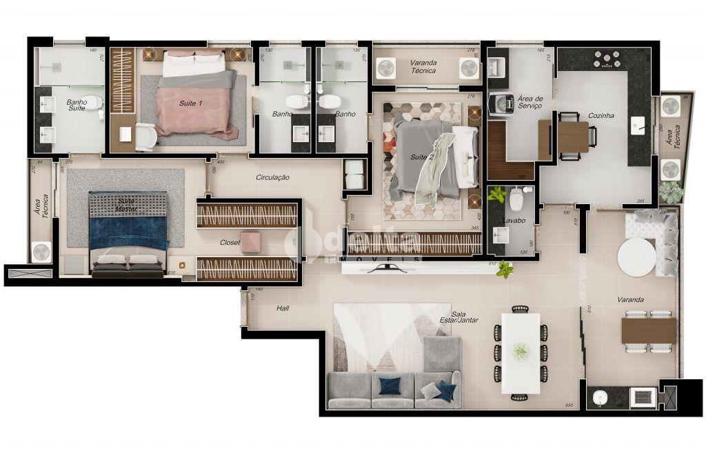 Apartamentos com área privativa de aproximadamente 132,33 m², sendo sala ampla em 2 ambientes, 3 suítes sendo uma master com closet, lavabo, varanda gourmet com acesso à cozinha, área de serviço ampla e independente, espaço para roupeiro, disposição para despensa, fino acabamento, porcelanato acetinado 80x80 nas áreas secas, porcelanato acetinado 60x60 nas áreas molhadas, gesso acartonado em todos os ambientes, bancadas em pedra preto imperial, esquadrias em alumínio preto, portas brancas com sistema anti-impacto, estrutura para ar condicionado na sala e nas suítes.