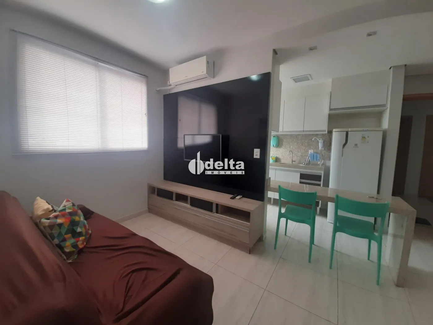 Apartamento mobiliado com 47 m², composto por sala equipada com sofá, mesa, cadeiras, cortinas, painel de TV e televisão, 2 quartos com armários planejados, sendo 1 com cama de casal e outro com cama de solteiro, ambos com ar-condicionado. Cozinha com bancadas, cooktop, exaustor, filtro de água e geladeira, além de lavanderia com máquina de lavar e armário.