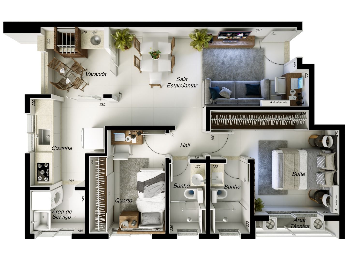 Cada unidade conta com duto em alvenaria para churrasqueira a carvão, uma suíte confortável, área de serviço, espaço técnico para condensadoras, além de preparação completa para ar-condicionado na suíte e na sala. Os acabamentos incluem esquadrias e portas sob medida, louças e metais de primeira linha, porcelanato extra em todos os ambientes e rodapé embutido, proporcionando um visual moderno e sofisticado.
