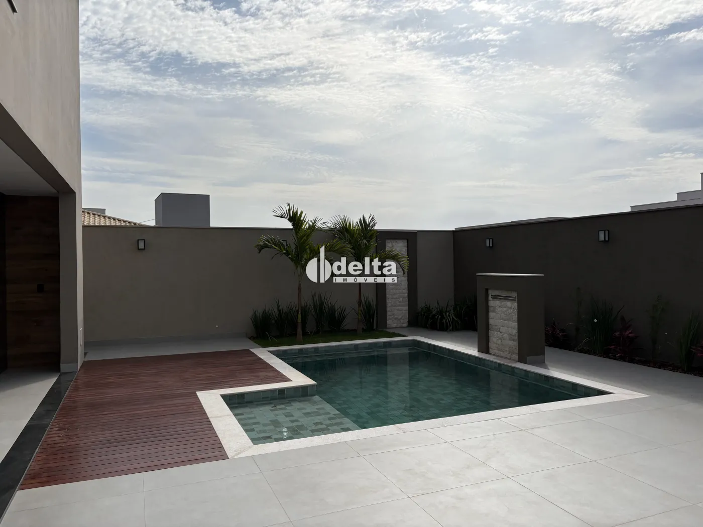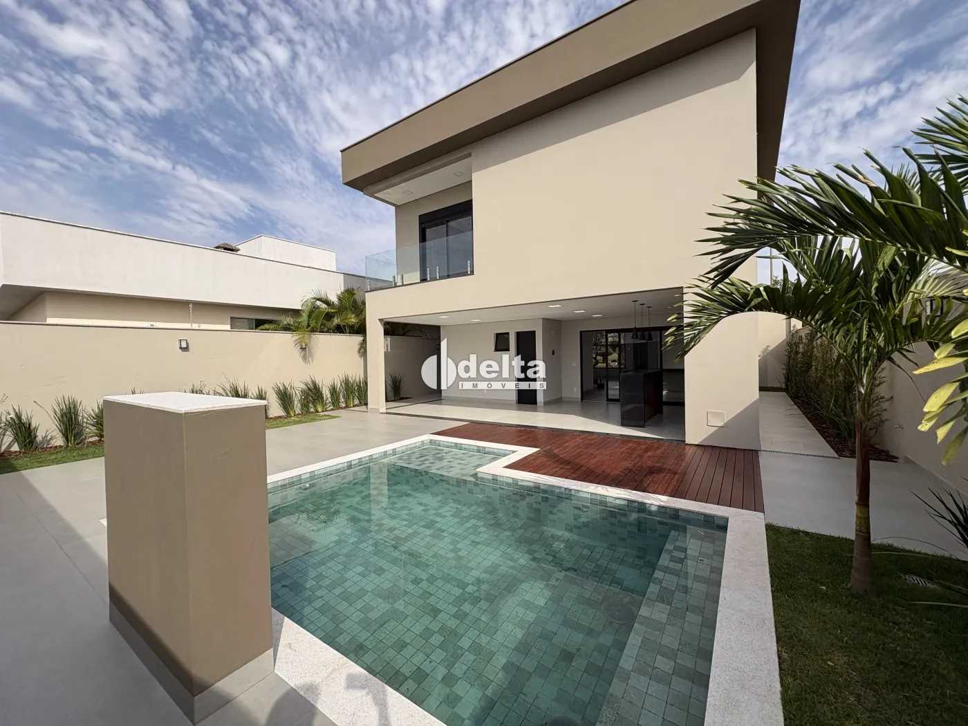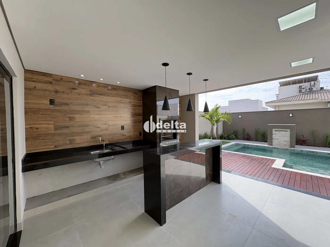 A área externa dispõe de piscina em pastilhas com deck de madeira, aquecimento solar, hidromassagem, iluminação em LED e cascata, integrada ao paisagismo que valoriza o projeto.