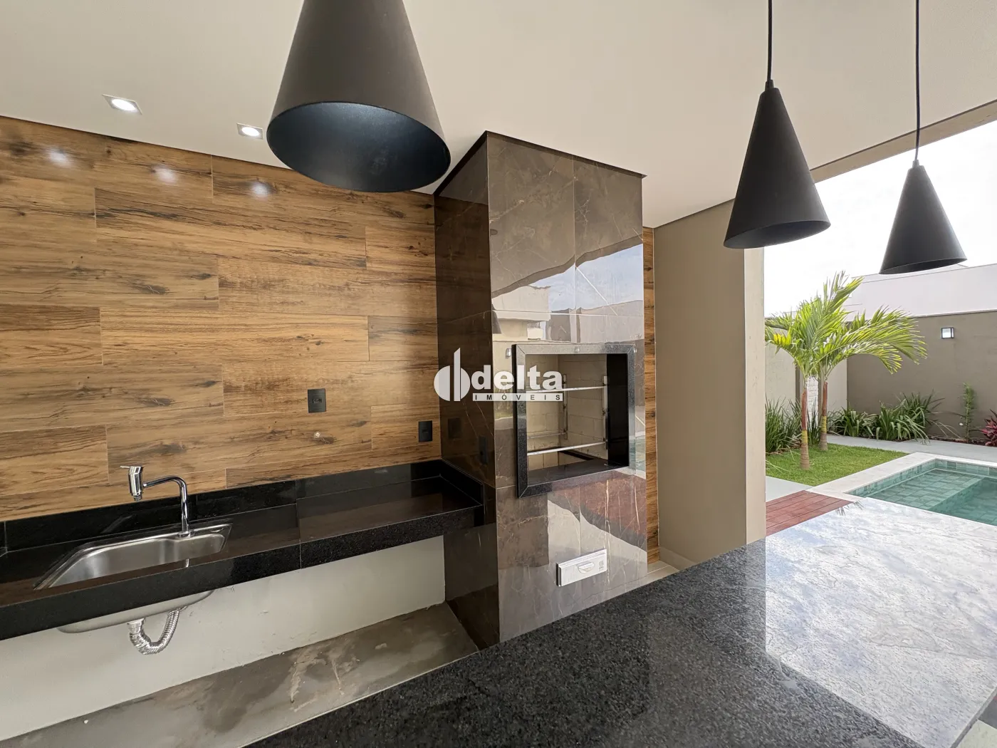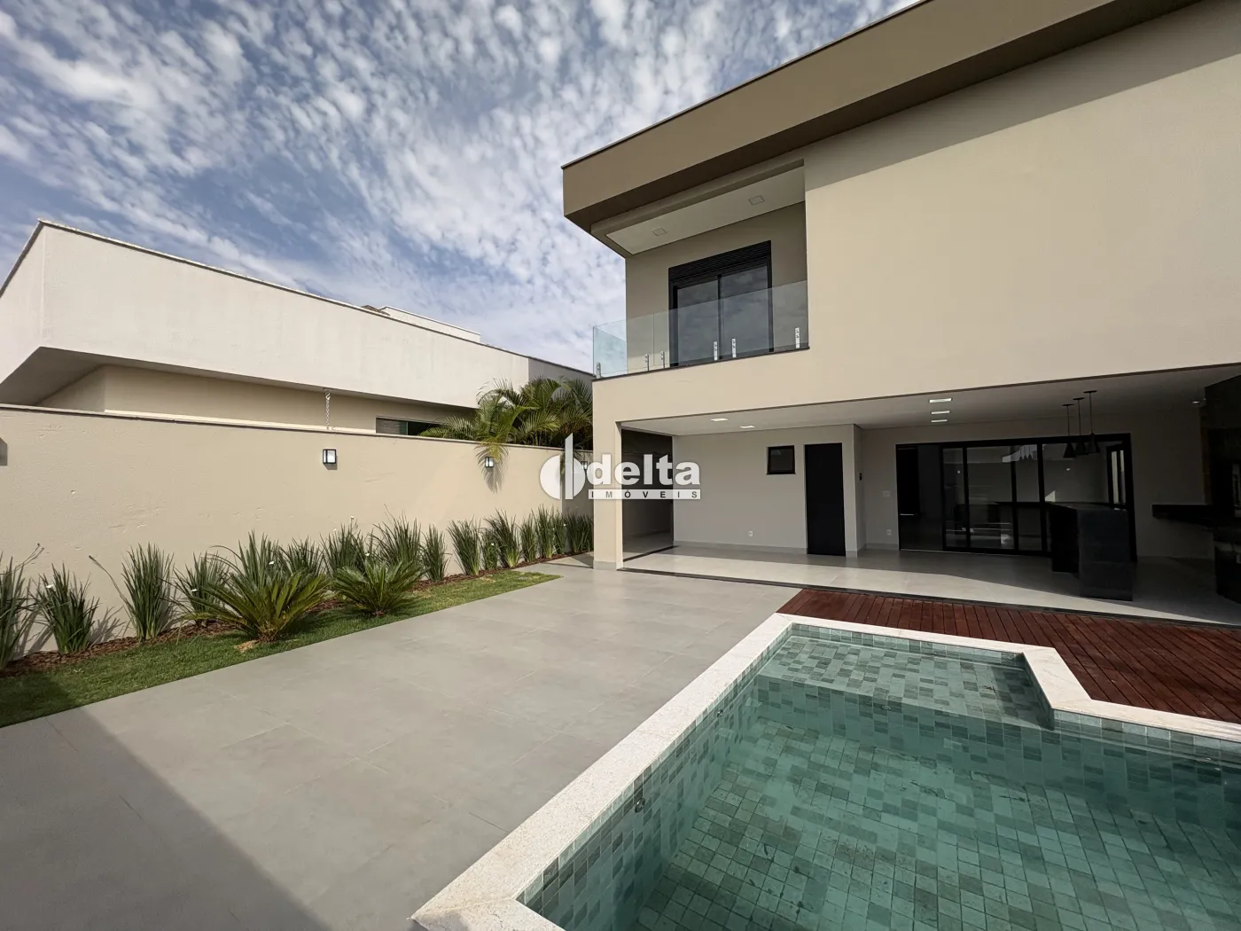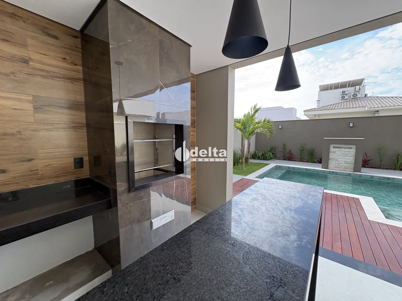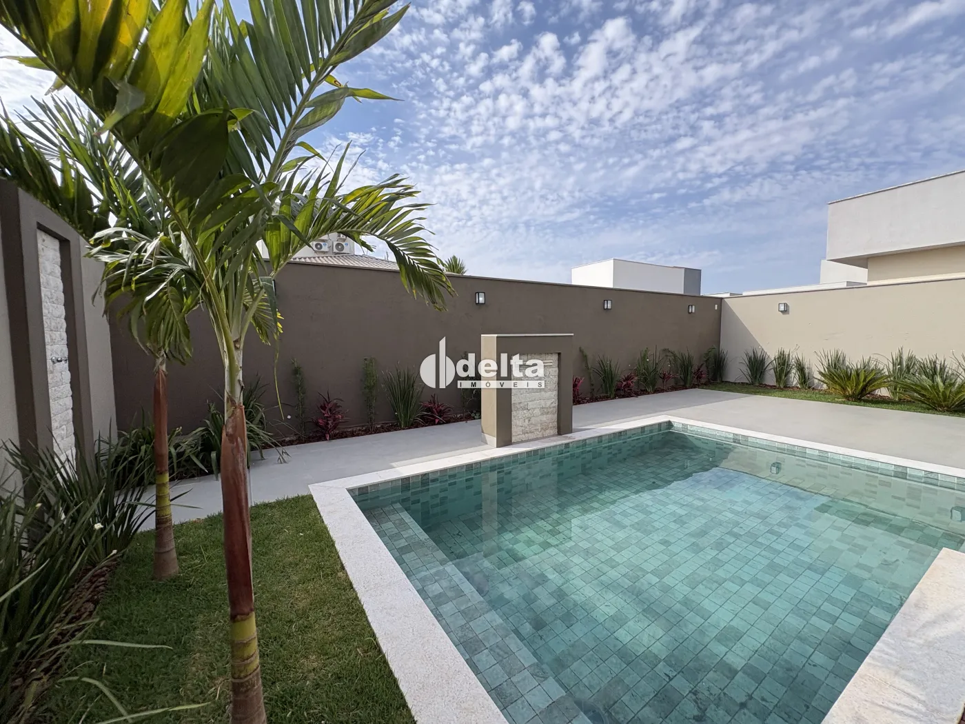A área externa dispõe de piscina em pastilhas com deck de madeira, aquecimento solar, hidromassagem, iluminação em LED e cascata, integrada ao paisagismo que valoriza o projeto.