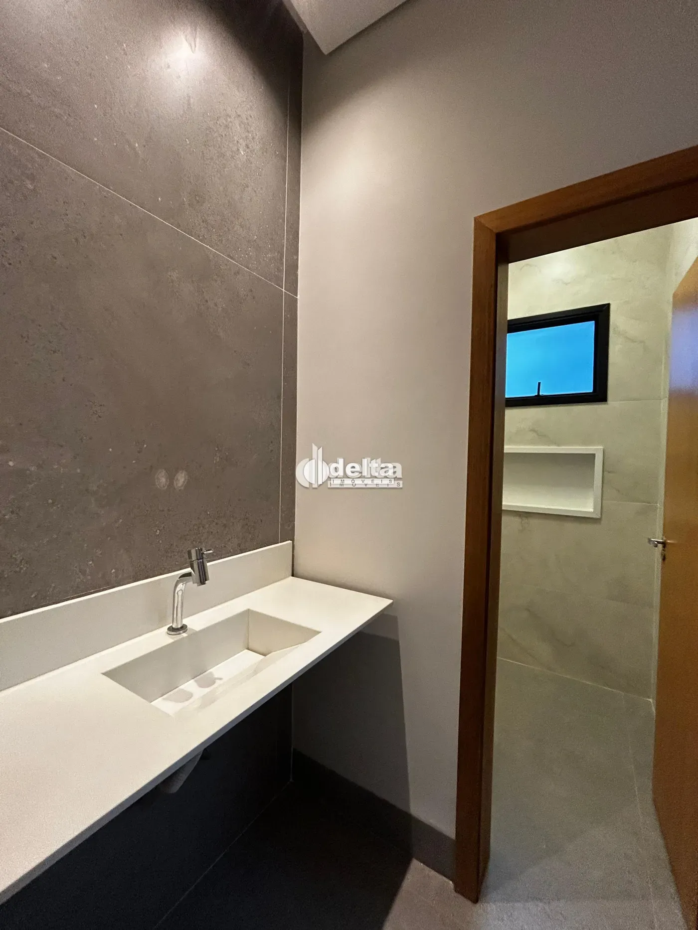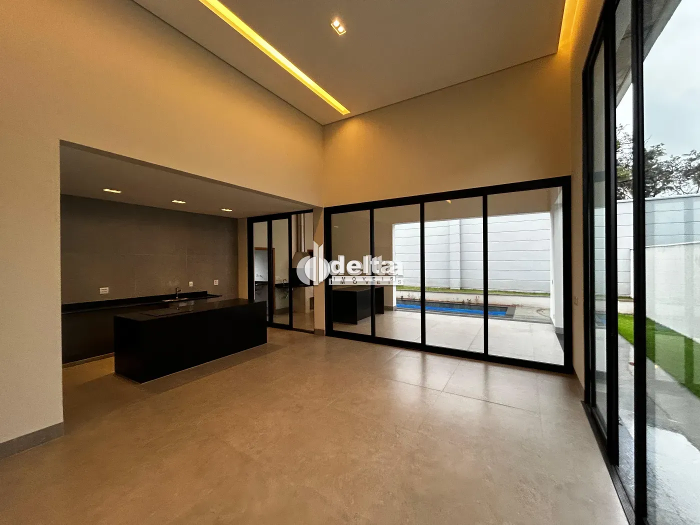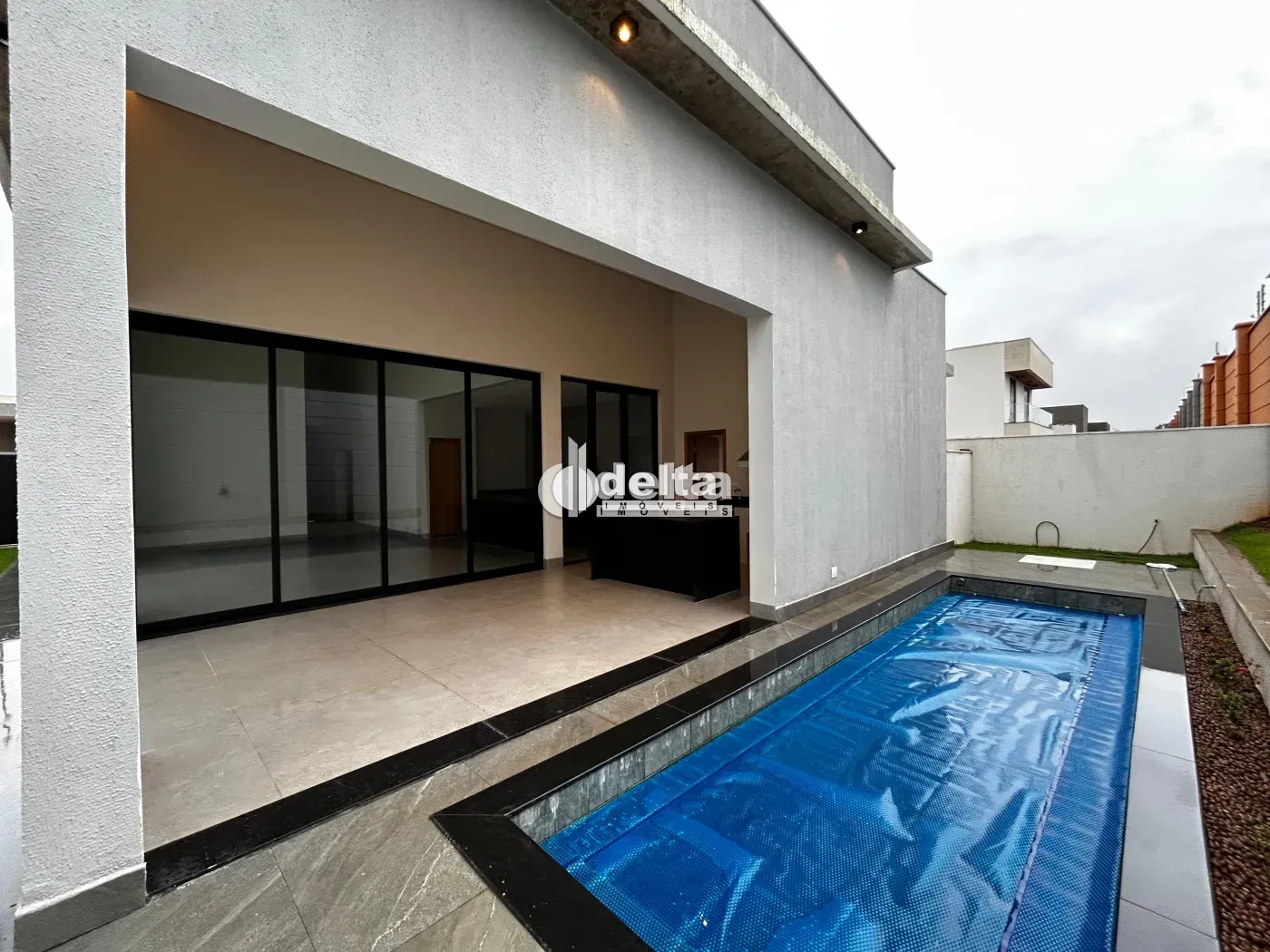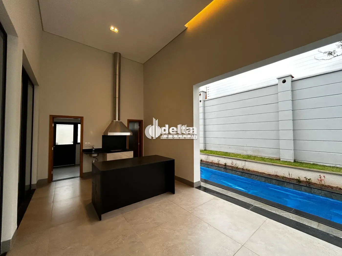 Casa em condomínio com aproximadamente 217,55m² de área construída e 454,99m² de área total. Possui sala ampla com pé direito alto, 3 suítes, sendo 1 máster com closet, escritório, lavabo, cozinha com bancada em ilha, área de serviço e varanda gourmet com piscina aquecida, churrasqueira e bancada. Inclui 2 vagas de garagem.