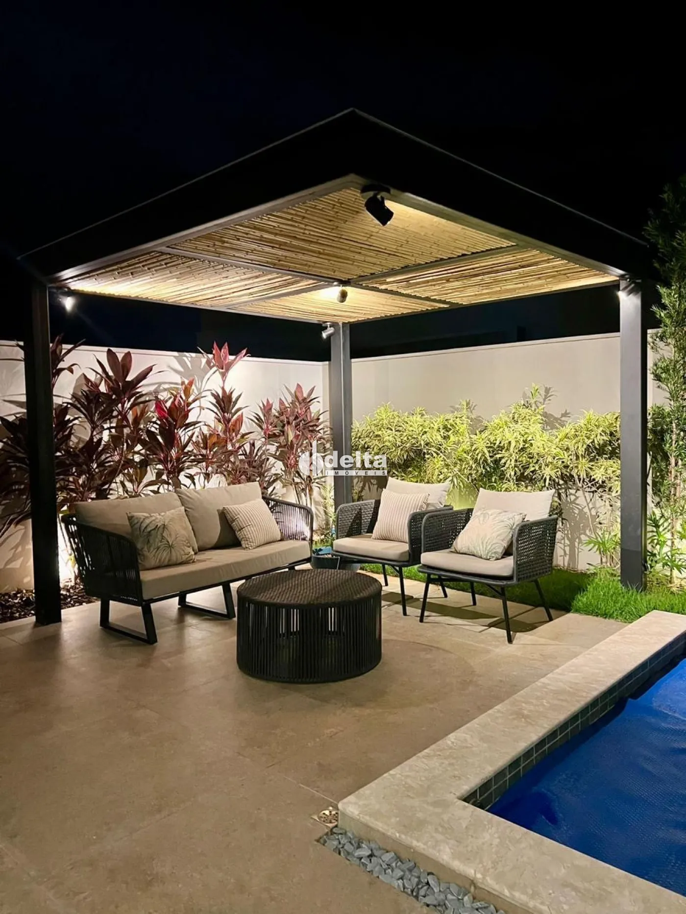 -pergolado em estrutura metálica e bambu