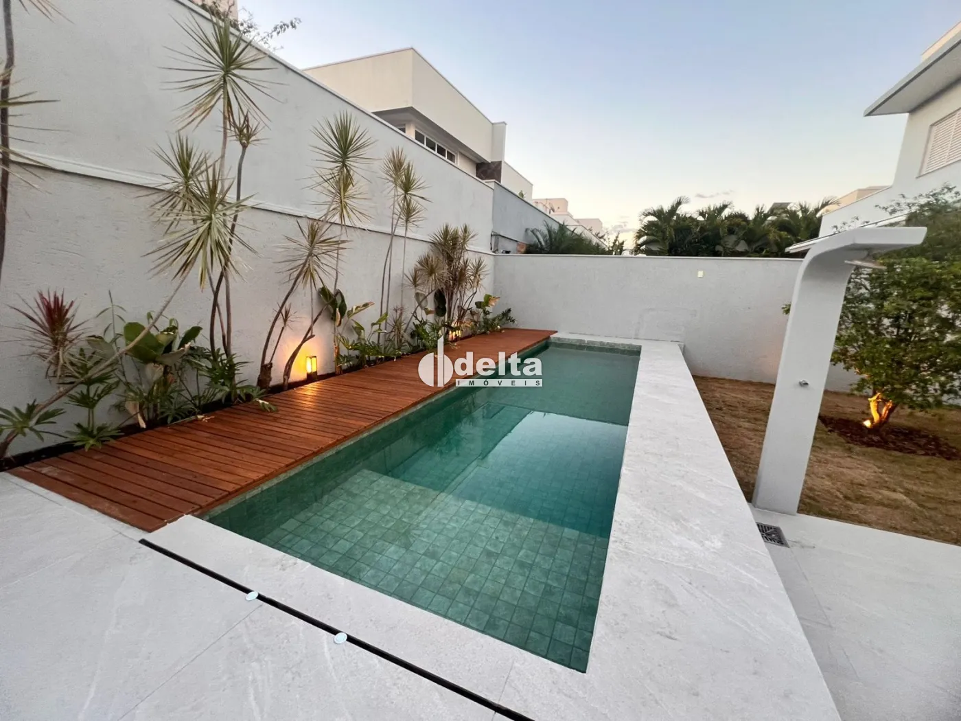 A área externa conta com piscina em pastilhas com hidro, churrasqueira a carvão revestida em porcelanato marmorizado, lavabo, espaço gourmet integrado e paisagismo pronto.