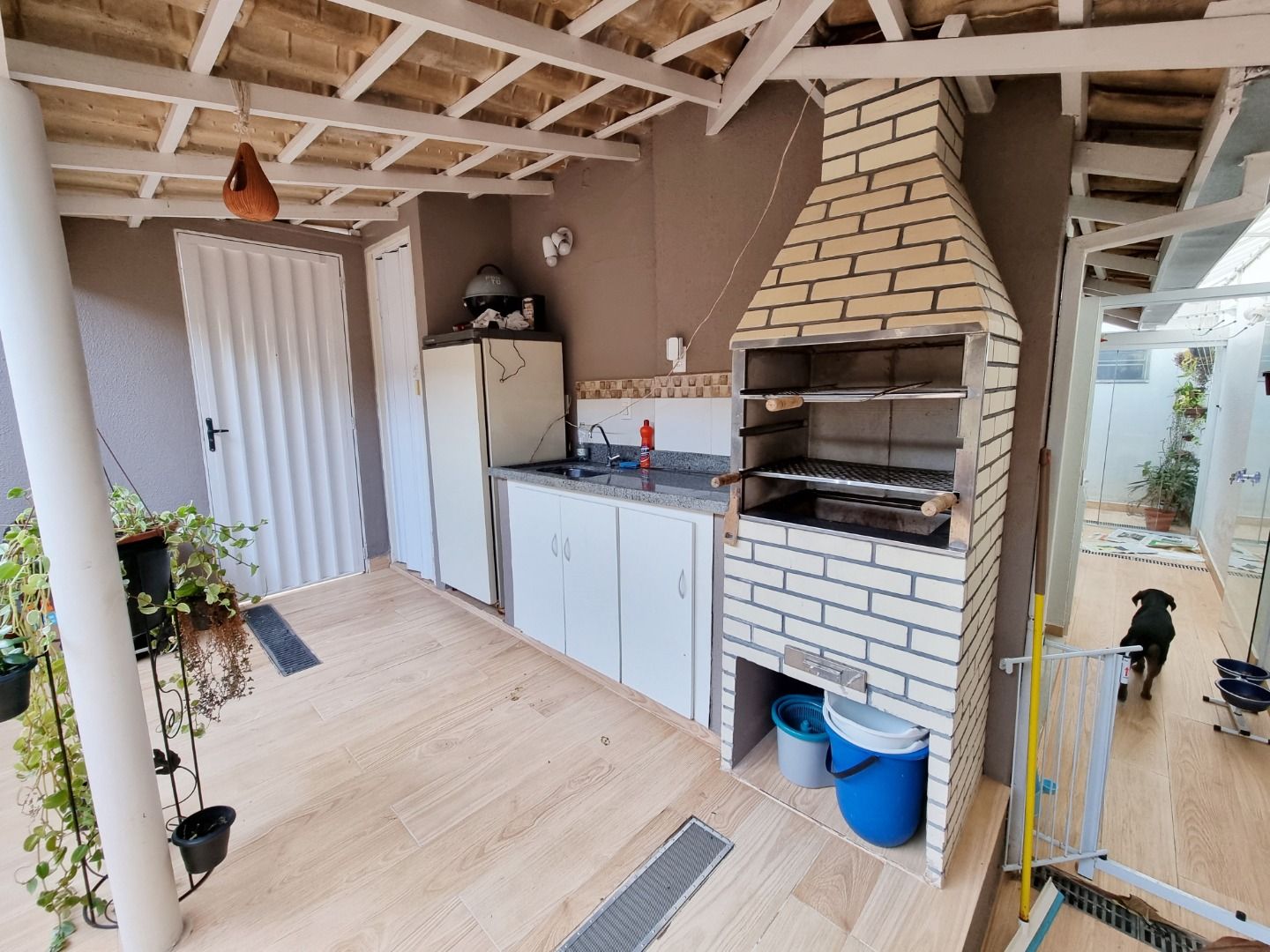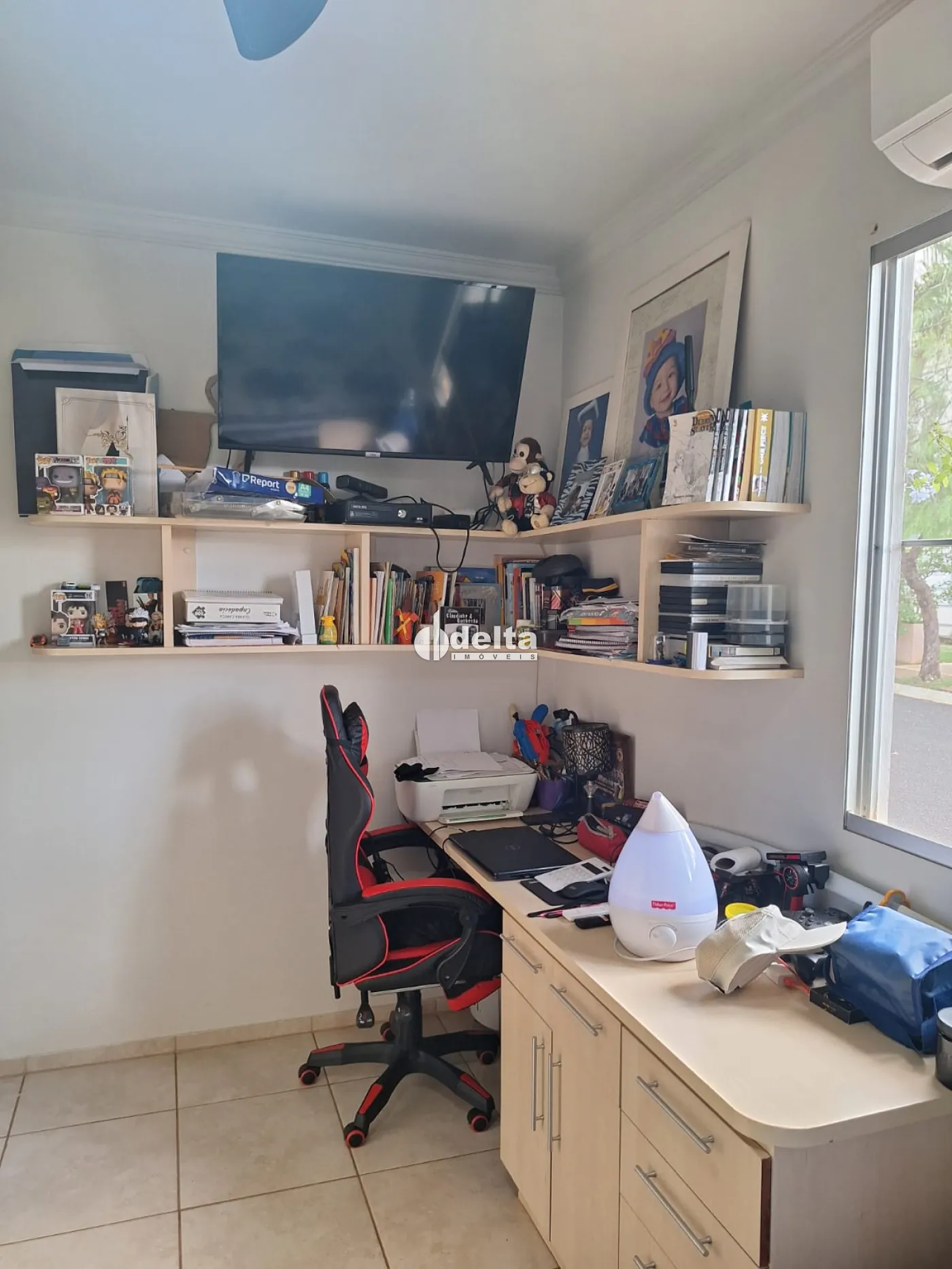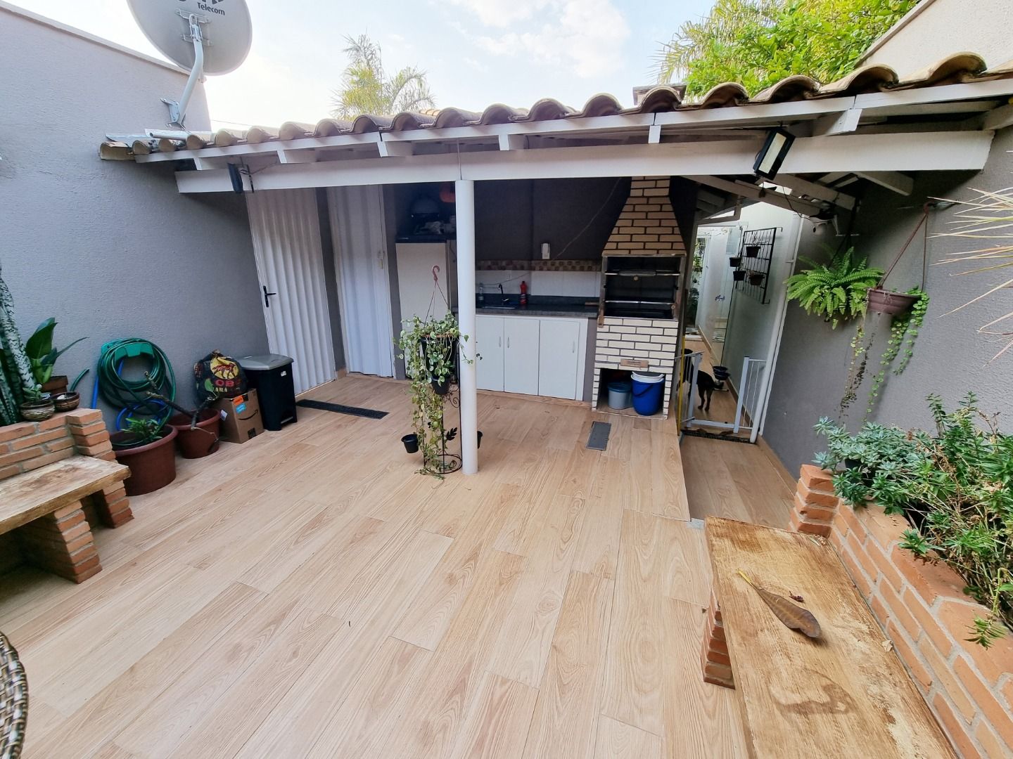 Casa em condomínio com sala ampla em dois ambientes com ar-condicionado, três quartos com armários, sendo uma suíte climatizada, banheiro social com box e armários, cozinha planejada, varanda gourmet com churrasqueira, ofurô, área de serviço e duas vagas de garagem livres.
