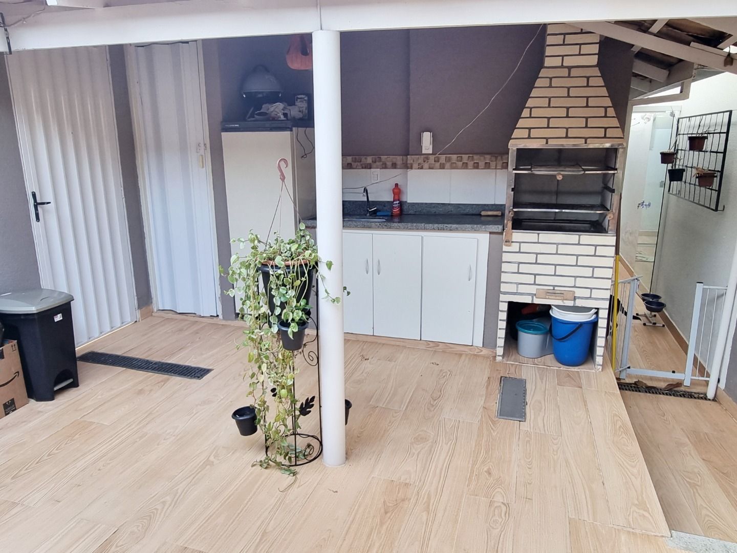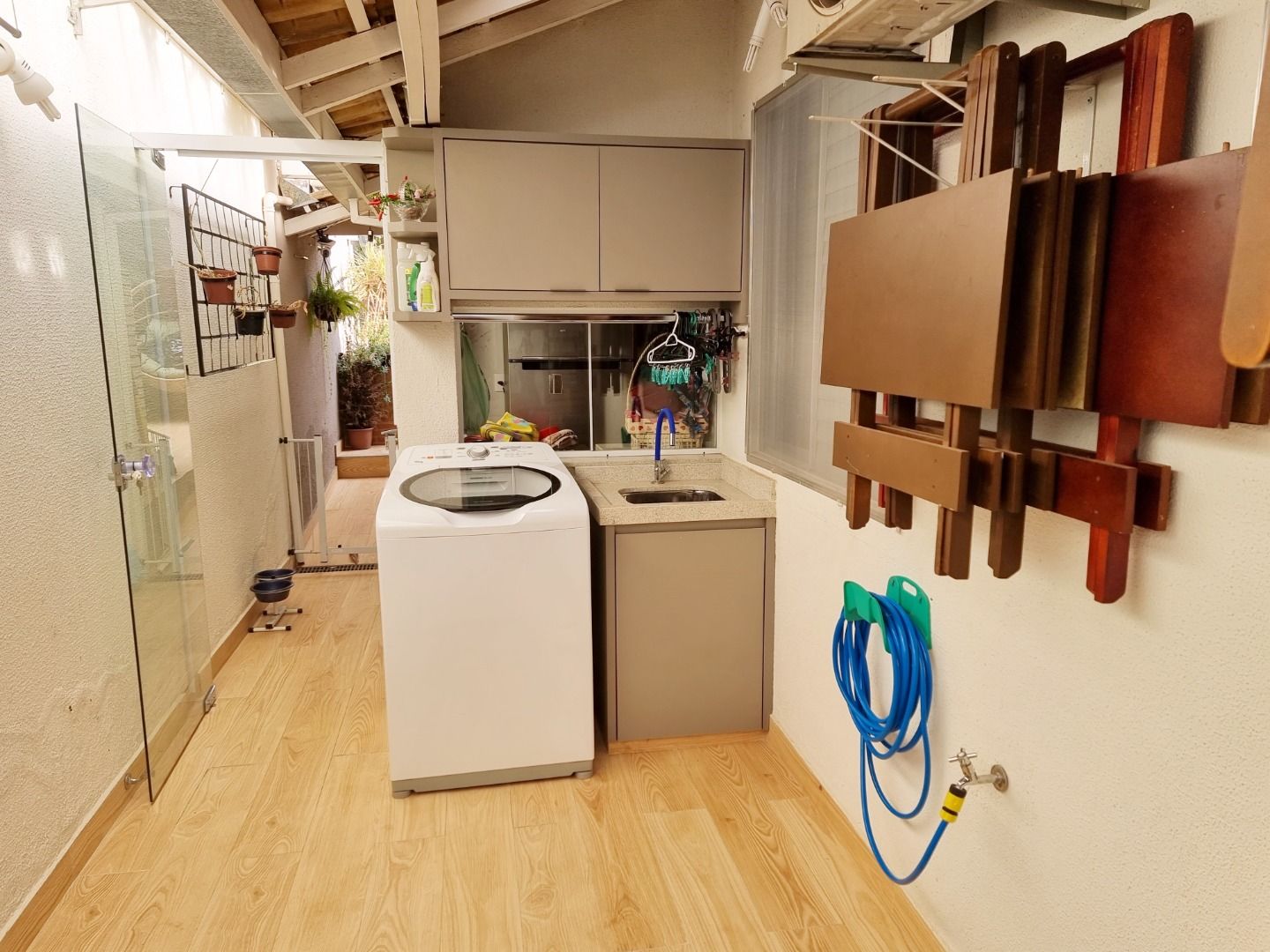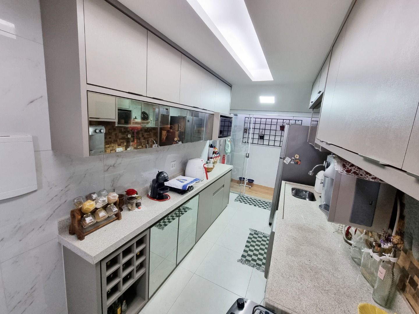 Casa em condomínio com sala ampla em dois ambientes com ar-condicionado, três quartos com armários, sendo uma suíte climatizada, banheiro social com box e armários, cozinha planejada, varanda gourmet com churrasqueira, ofurô, área de serviço e duas vagas de garagem livres.