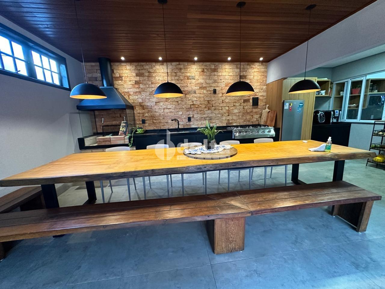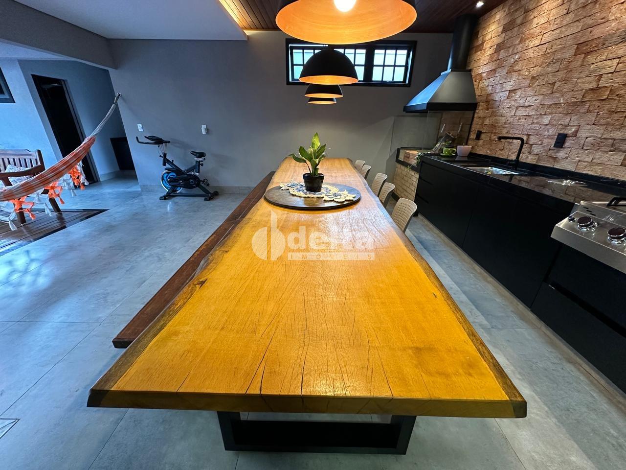 Sobrado com 4 quartos (2 no térreo, sendo 1 suíte com closet e outro usado como escritório), sala integrada ao jardim de inverno, banheiro social, ampla área gourmet com lavabo, cozinha interna e externa equipadas, piscina com deck e churrasqueira. Conta com água quente nas cozinhas e banheiros, sistema elétrico moderno, tomadas USB, garagem para 3 carros e estrutura para ar-condicionado. Energia solar negociável.