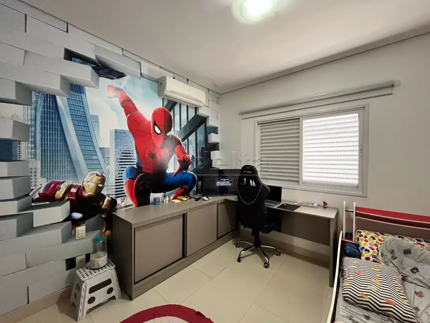A área externa conta com piscina aquecida, varanda gourmet com churrasqueira, um quarto adicional e um banheiro. A garagem acomoda até 4 veículos. Móveis planejados estão presentes na sala, cozinha, banheiros, quartos e área gourmet, garantindo funcionalidade e elegância em cada ambiente.