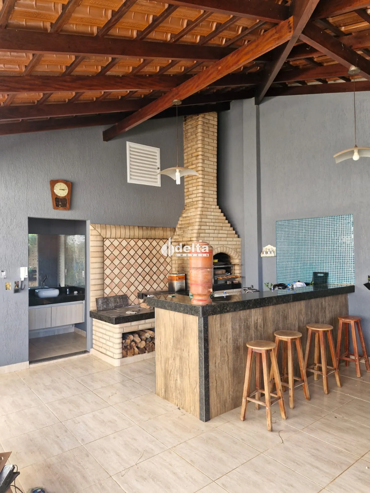 A casa possui 200 m² de área construída em terreno de 250 m², oferecendo sala ampla, três quartos sendo duas suítes, banheiro social com armário, cozinha estilo americana com armários, copa e área gourmet com fogão a lenha, churrasqueira e lavabo. Conta também com cômodo de despejo, ducha e três vagas de garagem.
